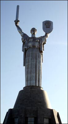 Ikke langt unna ligger Kievs største krigsmuseum. Ukraina mistet 8 millioner under annen verdenskrig, og behovet for å minnes de falne er stort. I 1981 ble derfor den enorme statuen Rodina Mat - også kjent som Iron Maiden eller jernjomfruen - reist. Dette monumentet er en over seksti meter høy kvinne i metall. Inludert sokkelen er statuen hele 102 meter høy, og den fjerde største i verden i sitt slag.
