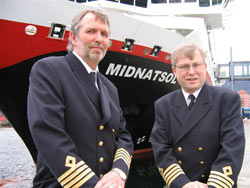 Arild Hårvik (t.v.) og Herodd Widding er kapteiner på MS «Midnatsol». Nå seiler de videre uten TV-kameraer om bord. Foto: NRK |