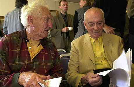 AP veteran Håkon Lie (tv) og tidligere industriminister Finn Lied snakker sammen under en pause i et debattmøte om privatisering av Statoil i Oslo Arbeidersamfunn. Foto: Knut Fjeldstad / SCANPIX |