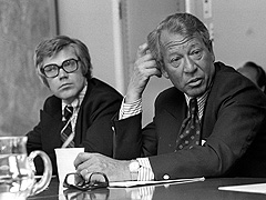 Oslo 1974: Handelsminister Jens Evensen holder pressekonferanse i Utenriksdepartementet, hvor han orienterer om den forestående havrettskonferansen i Caracas. T.v. sitter statssekretær i Handelsdepartementet, Arne Treholt. Foto: NTB / SCANPIX |