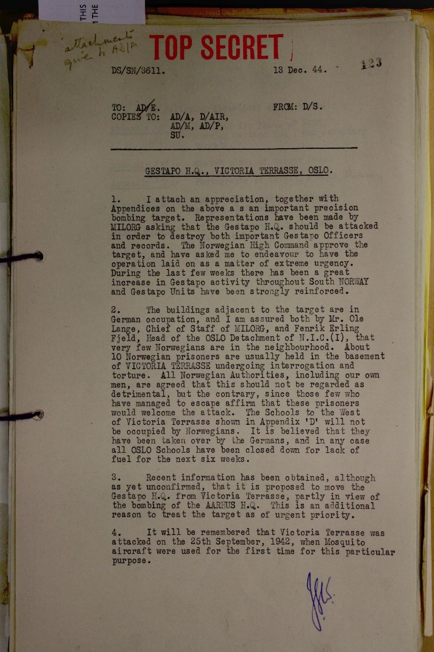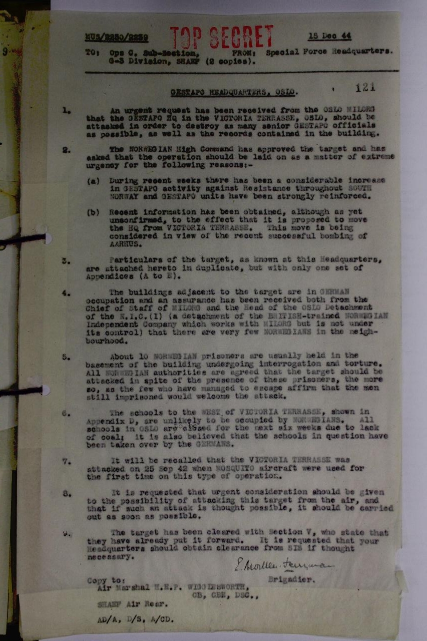 Før Hjemmefronten bad britene om et flyangrep, vurderte man å sprenge Victoria terrasse med en bombe i kjelleren. Det ble vurdert som en for risikabel strategi på grunn av større fare for tyske gjengjeldesaksjoner enn hvis angrepet kom fra britene.