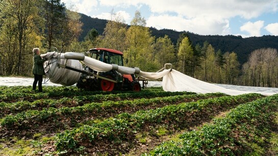 Det er rekordtidleg avduking av jordbæråkrane i Valldal på Sunnmøre i år.