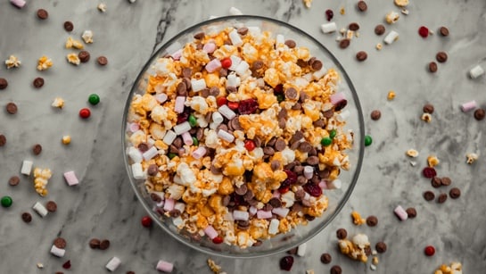 Skikkelig knask med popkorn blandet med karamell, sjokolade og marshmallows.