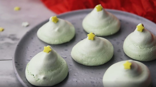 Det skal ikke så mye til for å gjøre helt vanlig marengs om til små juletrær. Ellen Aabol har kjøpt inn grønn konditorfarge og gule kakepyntstjerner til julemarengsen.