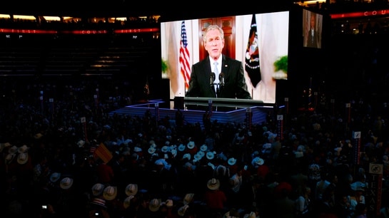 Dette er nattens tema på republikanernes landsmøte, hvor George W. Bush skal tale til partifellene via satellitt.