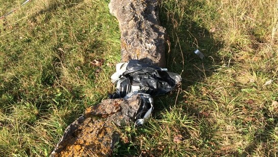 Surret inn i en søppelsekk og festet med duktape, ligger det fredede kulturminnet «Langesteinen» fortsatt ubeskyttet for vær og vind i grøftekanten i Steigen. Det har den gjort siden en kantklipper meide den ned i sommer.