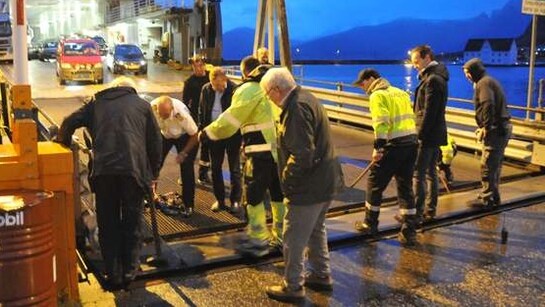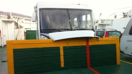 Ein lem vart feilaktig opna under ombordkøyring på B/F «Sogn» laurdag ettermiddag. Ein campingbil hadde ingen sjanse til å stoppe og køyrde rett inn i lemmen.