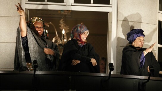 Den liberiske fredsaktivisten og nobelprisvinnere Leymah Gbowee refser sin medvinner Ellen Johnson Sirleaf.