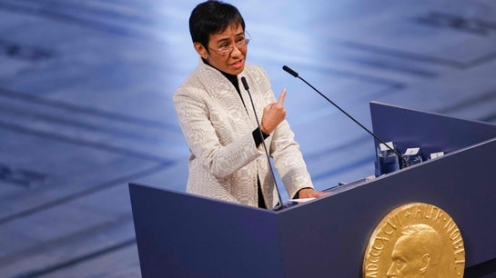 Årets vinnere av Nobels fredspris, amerikansk-filippinske Maria Ressa og russiske Dimitrij Muratov holder pressekonferanse på Nobelinstituttet klokken 13.
