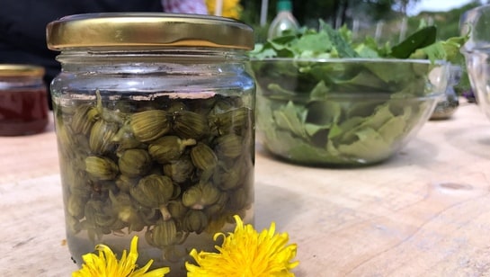 Hanne Frosta plukker knopper av løvetann for å bruke dem i matlagingen. Syltede løvetannknopper er veldig gode i salat.