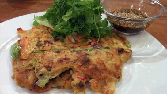 Haemul pajeon er en koreansk sjømatpannekake med vårløk, blåskjell, reker og blekksprut.