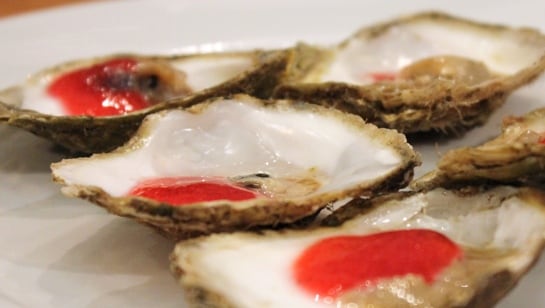 En liten forrett med østers. Hanne Frosta er opptatt av å bruke norske råvarer. Derfor blir det rips. Ikke sitron.