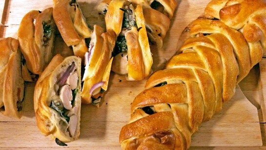 Innbakt pizza med fyll av kylling, løk og blåmuggost. Dette er en hvit pizza, uten tomatsaus, men med rømme. Oppskrift fra Inge Johnsen i radioprogrammet Brønsj.