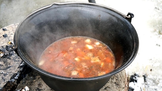 Kokk Inge Johnsen har med seg en god gryte til bålet. Han koker suppe med gulrøtter, bønner, hermetiske tomater og karbonadedeig.