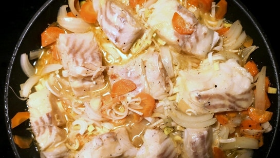 Torsk med poteter, fennikel, gulrøtter, purre og løk som er rask å lage. Og imens koker ertene til ertepuréen.