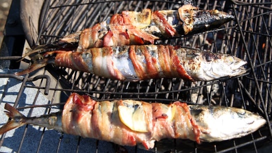 Kombinasjonen av røyking og grilling er en metode som passer perfekt til feit fisk som makrell. Den tåler også kraftig tilbehør som bacon. I tillegg til å gi smak beskytter baconet fiskeskinnet, så det ikke revner. Andreas Viestad tilbereder makrellen i Sommeråpent.