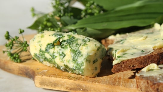 Det er ikke alle som vet hvor enkelt det er å lage sitt eget smør. Hvis du bruker rømme i tillegg til fløte, får smøret en fin syrlighet. Her smaksetter jeg smøret med ramsløk og havsalt, men du kan også bruke en kombinasjon av urter, for eksempel rosmarin, timian og salvie, sier Andreas Viestad. Oppskriften er fra Sommeråpent.
