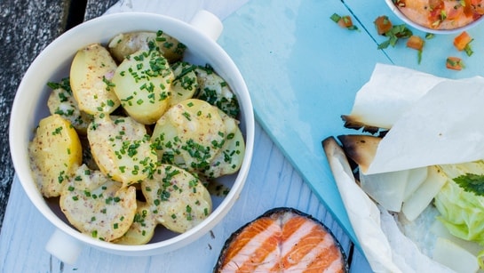 Nypoteter er nydelige i seg selv, og de kan blandes med nesten hvilke krydder og smaker som helst. Potetsalat med sennepssaus er bankers til rød fisk, skinke og ribbe. Og den kan fint lages dagen i forveien om du venter gjester til lunsj.