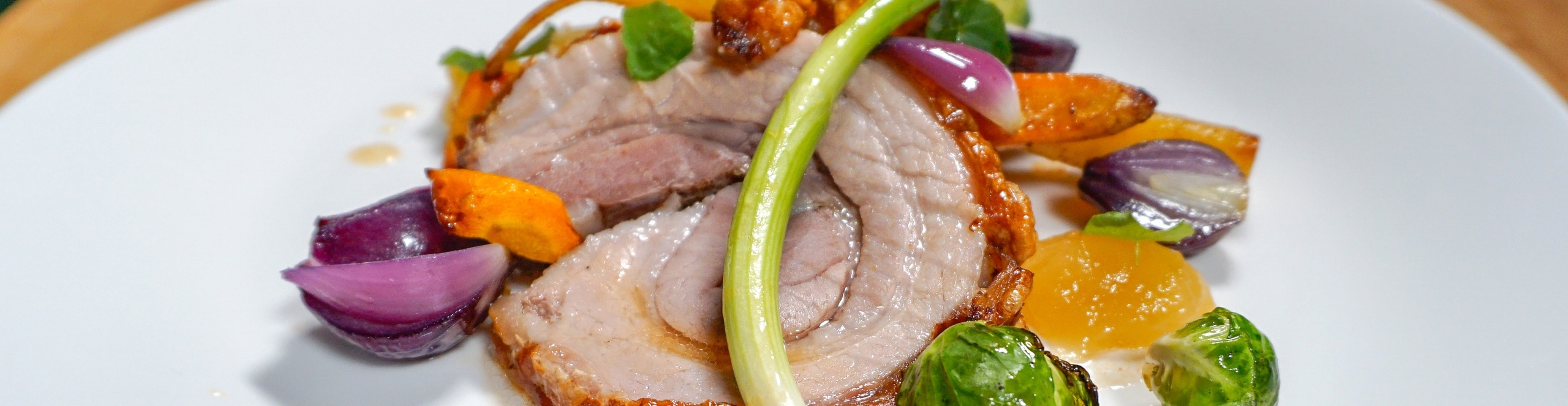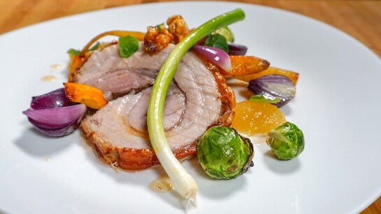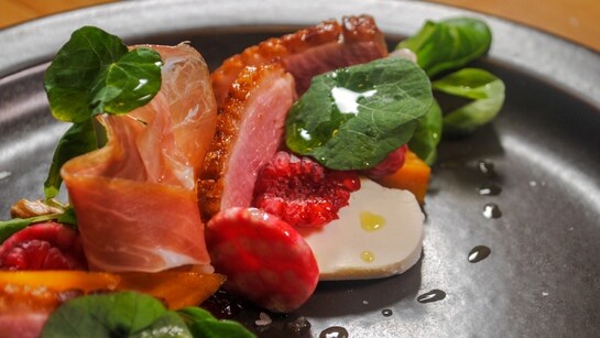 Andebryst med sprø svor, beter i flotte farger, spekeskinke, valnøtter og bringebær blir en flott forrett.