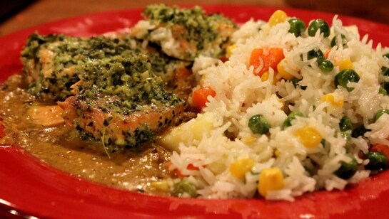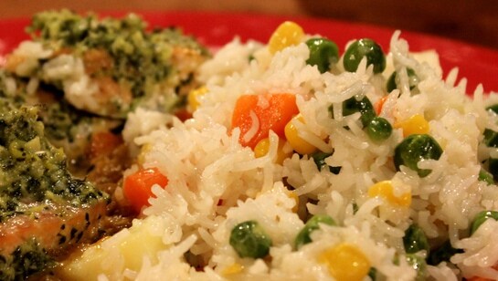 Det er mer spennende med ris som har fått litt ekstra tilbehør. Her er det grønnsaker og krydder som gir det lille ekstra. Vegetar pilau serverer Sarita Sehjpal til myntemarinert laks (se oppskrift under Tips).