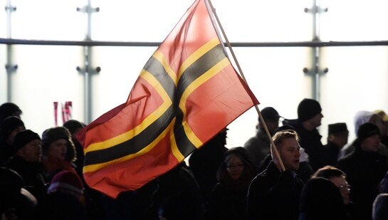 BERLIN (NRK): Under demonstrasjonene til den innvandringskritiske gruppa Pegida bruker tilhengerne et flagg som til forveksling kan ligne det norske. Men, det er altså ikke det.