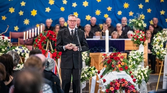 Motstandsmannen og forfattaren Ragnar Ulstein (99) blei gravlagt i dag. Kronprins Haakon og Forsvarsministeren var gjestar i gravferda.