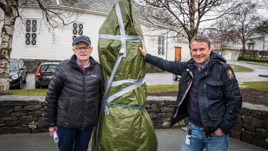 Bysten av krigsveteranen Ragnar Ulstein står nå på rådhusplenen foran Ulstein kyrkje. Foreløpig er den godt skjult under en presenning. Lørdag blir den avduket av forsvarsminister Ine Eriksen Søreide.