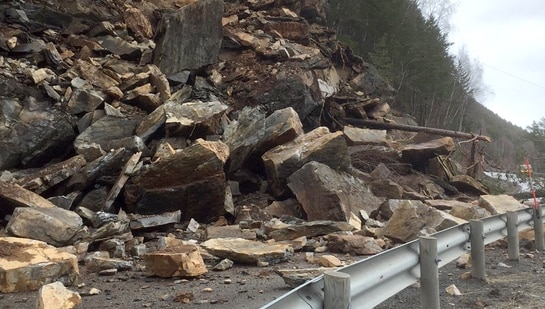 Et steinras stengte riksvei 70 ved Gjøra. Det er ingen omkjøringsmuligheter på stedet, og i en periode var bygda delt i to.