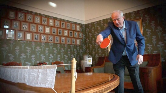 Geir Lundestad er ein fredens mann, men manglar definitivt ikkje konkurranseinstinkt i bordtennisduell med Linda Eide.