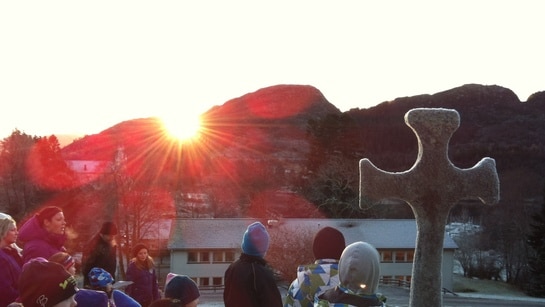 På den kortaste dagen i året klokka 12.00 fall sollyset på den angliske krossen i Eivindvik. Det feira gulingane med å stemme i allsang.