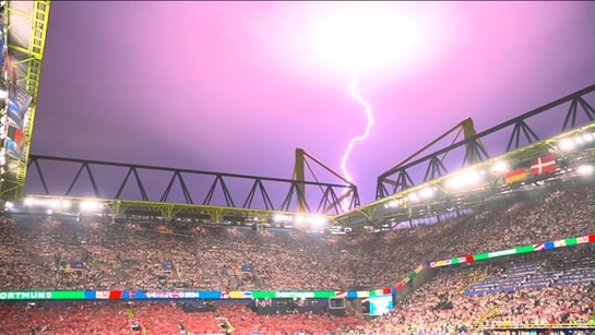 En drøy halvtime var spilt mellom Tyskland og Danmark da lynnedslag, styrtregn og tordenvær satte en midlertidig stopper for kampen.