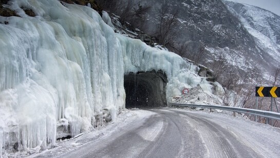 Denne isdekte tunnelopninga var synet som møtte Jarle I. Kvam då han køyrde fylkesveg 53 på veg til heimbygda Årdal for nokre dagar sidan.