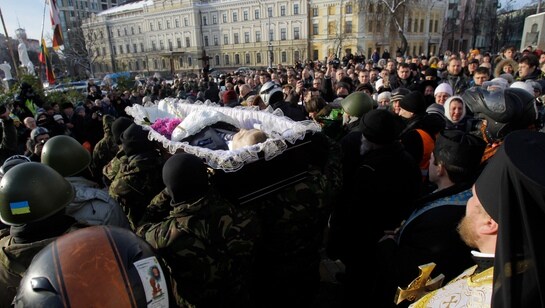Folkemengden ropte «helt!» og sang nasjonalsangen da kisten til en 25-år gammel mann ble båret gjennom Kievs gater i dag. Han var en av dem som ble drept i opptøyene onsdag.