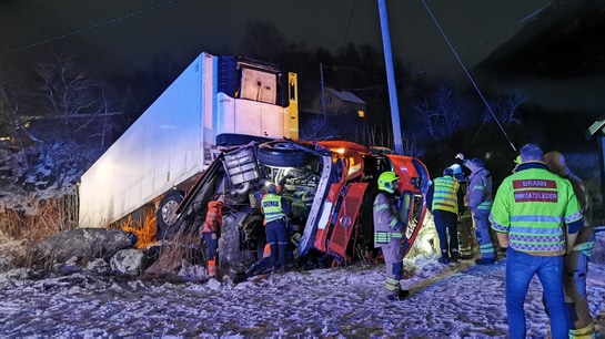 Forbipasserende hjalp brannvesenet med å få føreren ut av traileren, da den havnet i elven. Føreren er fraktet til Haukeland sykehus.