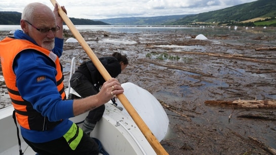 Frivillige tek i bruk båt for å få i land rundballar som har hamna på Mjøsa. Statsforvaltaren frykter at dei kan søkke om få dagar.