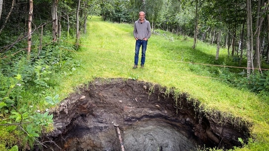 I mange år har det dukket opp flere og flere synkehull på Per Øyvind Skogum sin eiendom. Men ingen vil ta ansvar.