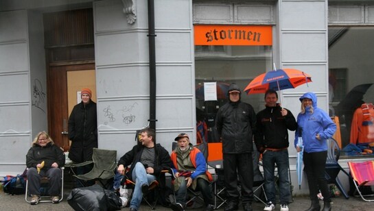 AaFK-supportere ligger i kø for å få kjøpe cupfinalebilletter fra supporterklubben Stormen.