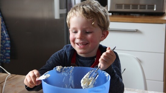 Oscar (4) er som de fleste barn veldig glad i is. Han lager sin egen.