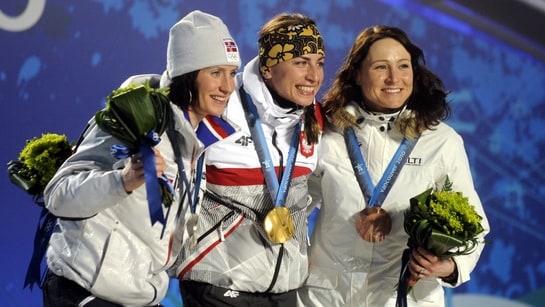 En strålende fornøyd Marit Bjørgen mottok sin femte medalje under utdelingen natt til søndag.