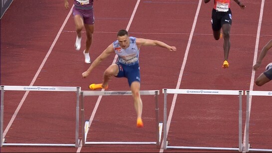Karsten Warholm så lenge ut til å få en pangstart på sesongen, men på siste hekk røk seieren og han ble slått av rivalen Alison dos Santos.