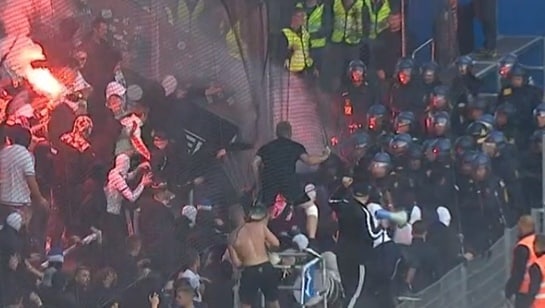Dansk politi skal ha blitt angrepet av FCK-fans under derbyoppgjøret mot Brøndby, søndag. En vakt skal ha blitt skadet.