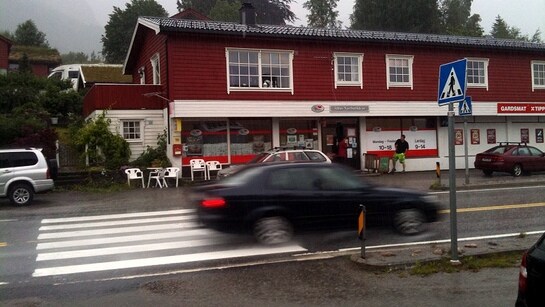 - All straum er vekke og det regnar verre enn verst. Parkeringsplassen fløymer over, skildrar NRK-reporter Silje Guddal frå Eikaasgalleriet.