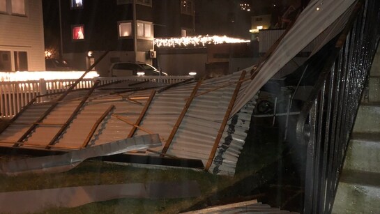 Gunnar Isachsen i Odda vakna til et blikktak som hamna i husveggen. No er staden isolert etter uvêret i Vestland.