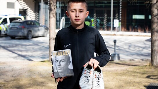 Yevheniy (13) fikk så vidt med seg en ukrainsk bok om Ronaldo og fotballskoene.