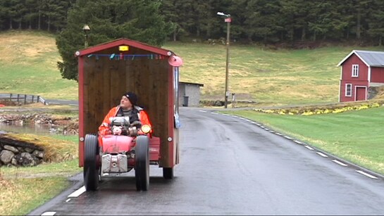 Knut Rune Tveiten skal køyre Norge på langs - i ein gammal tohjulstraktor - med ei hytte på slep...