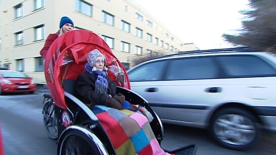 Med lue og ullteppe suser 88 år gamle Sidsel Meland nedover bakken. El-sykler er det nye på Sagenehjemmet.