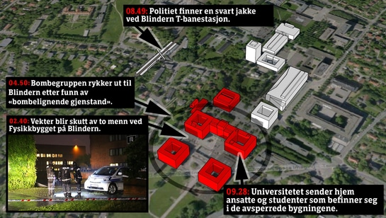 Faren er over etter at en bombeliknende gjenstand ble funnet på universitetsområdet på Blindern i Oslo. Men politiet leter fortsatt etter to menn som skjøt en vekter på stedet i natt.