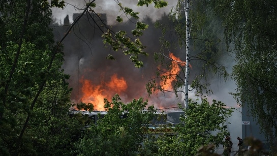 Det har brent kraftig på Gjøvik ved Hunton siden onsdag morgen. Torsdag ettermiddag pågår fortsatt slukningsarbeidet, men riksveg 4 er åpnet.