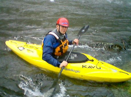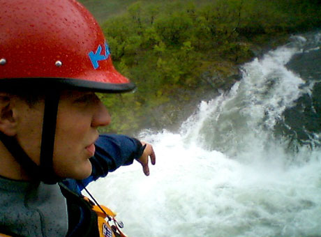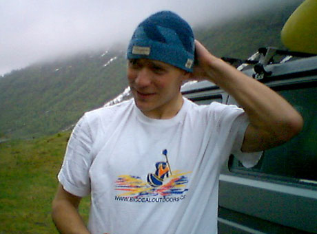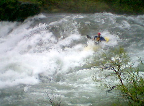 Benjamin er lykkelig i det våte element, men dette er siste tur idag i denne elva. Elva er rett og slett for vill og for full av vann til at det er trygt med bare to padlere.