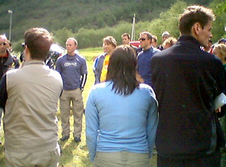 Tom Erik Heimen briefer folket. Overhørt setning (fritt oversatt): Det er farlig å hoppe her.